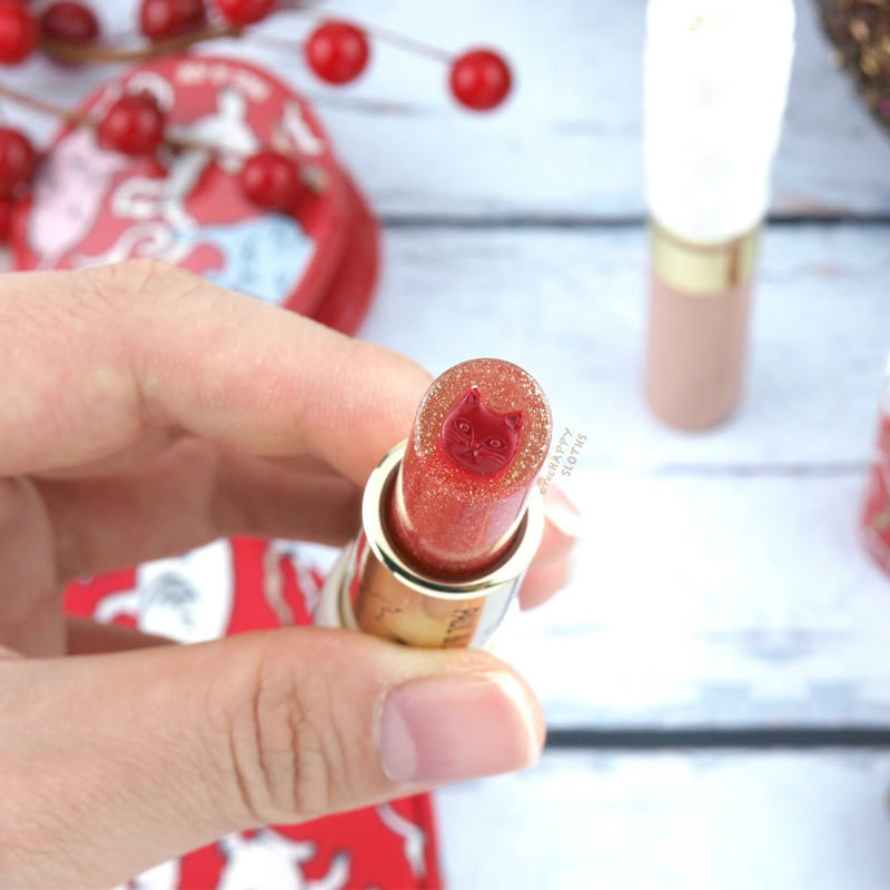 A grande estrela desse kit é o batom com a carinha de gato em alto relevo. É o tipo de coisa que dá até dó de usar. O batom tem uma pegada de balm mesmo, mas ele entrega uma cor avermelhada aos lábios.