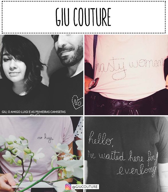 Giuliana Mesquita criou sua Giu Couture meio que por acaso. “Comecei porque o presente de aniversário do meu melhor amigo (o editor de moda Luigi Torre) não chegou a tempo, então comprei uma camiseta da Hering e bordei. Foi tudo beeem orgânico, as pessoas foram vendo, gostando e pedindo. Daí fiz o insta e a coisa bombou :)”, contou a jornalista de moda.