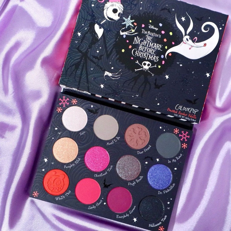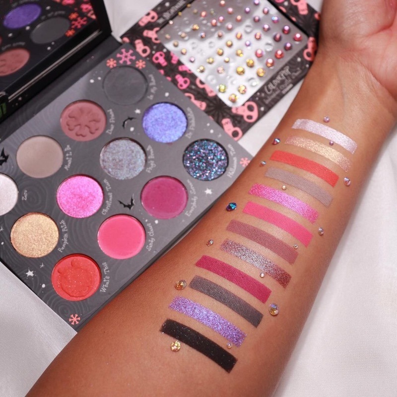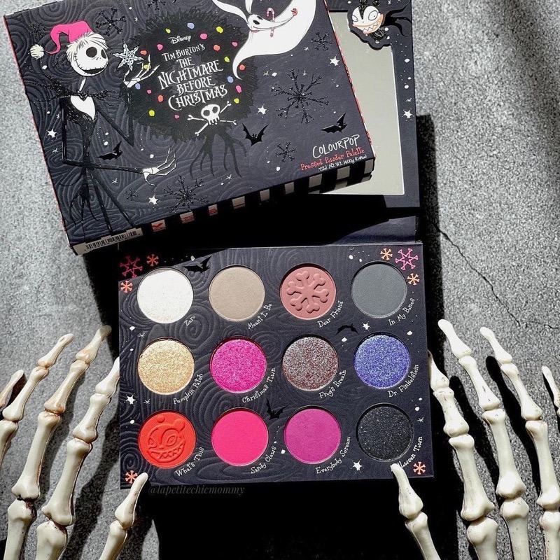 As cores da paleta são: Zero (prata cintilante); Meant To Be (bege claro acinzentado matte); Dear Friend (marrom médio rosado acinzentado matte); In My Bones (cinza escuro matte); Pumpkin Patch (dourado cintilante); Christimas Town (pink cintilante); Frog’s Breath (marrom/rosa acinzentado duochrome); Dr. Filkenstein (roxo azulado cintilante); What’s This (laranja escuro com leves brilhos dourados); Sandy Claws (goiaba matte); Everybody Scream (rosa escuro intenso matte); Halloween Town (preto com brilhos roxos e verde-água).