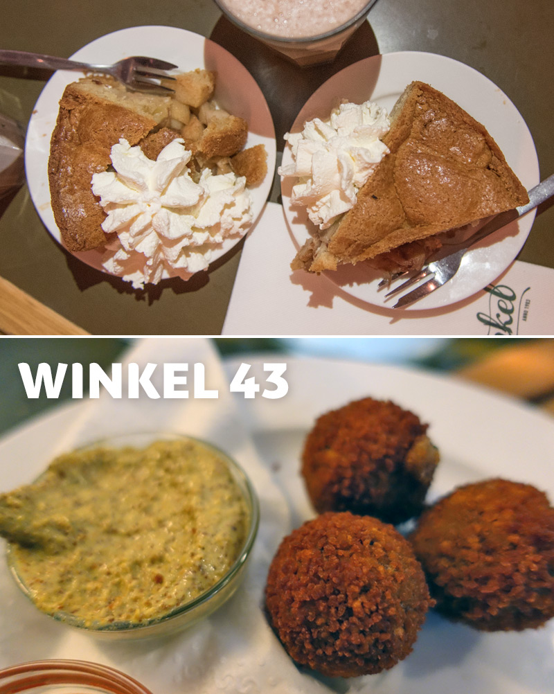 Todo mundo que está planejando uma viagem para Amsterdã já ouviu falar do Winkel 43. É lá que servem a tal #8220;melhor torta de maçã de Amsterdã”, mas acabamos provando mais que a torta. Não havia almoçado no dia e cheguei FAMINTA (hahaha) ao restaurante. Pedimos uma entrada de croquetes (super típico de lá e muito maravilhoso em todos os lugares que comi, saudades!) e rolinho primavera (hahaha que randômico!). Cada entrada custa uns €5. Também pedi um prato que era um frango à moda asiática (não fotografei), mas que eu eu descreveria como um strogonoff com um toque de curry e um arroz muito maravilhoso (acho que era de jasmim, sabe?). E por fim, claro, a torta, acompanhada de chocolate quente ainda por cima, hahah! Gente, amei TUDO nesse lugar. Tudo era gostoso e salivo só de lembrar! Lugar simples, cheio, super turístico, mas cara, muito gostoso (bom, eu estava com fome, dizem que é o melhor tempero, né?)!