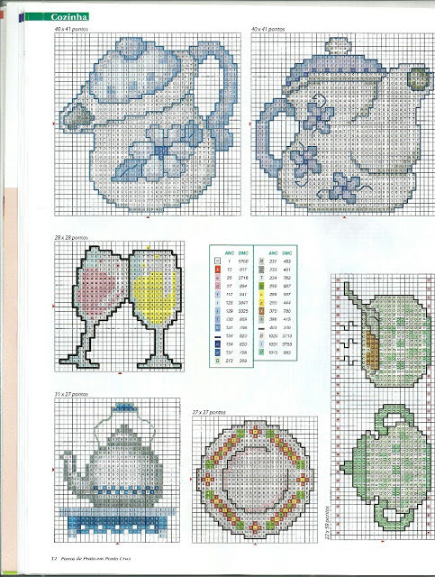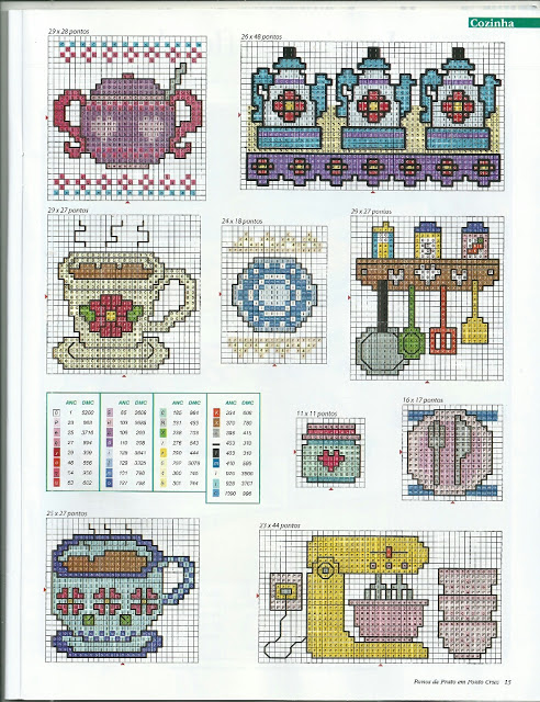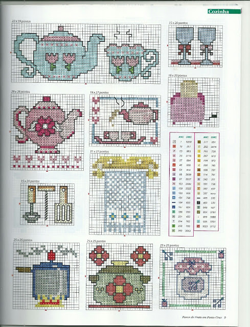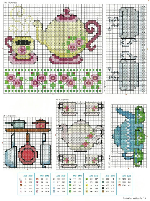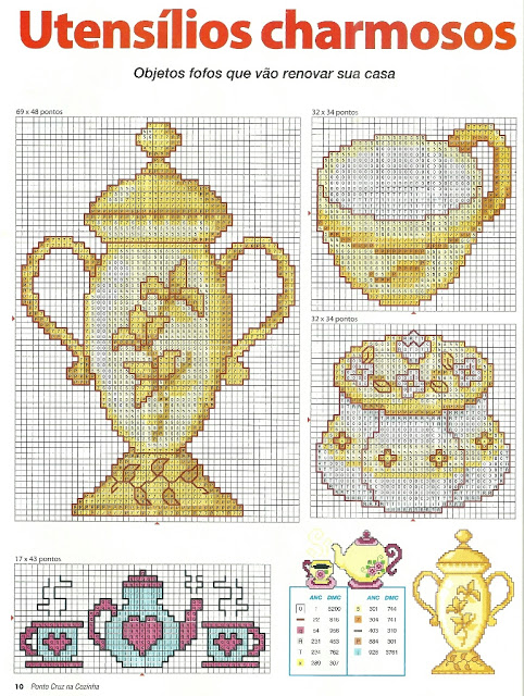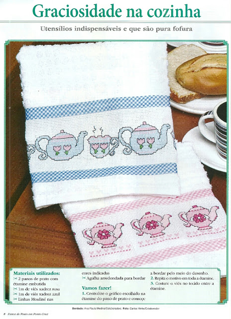 Hoje começaremos a semana com a “Cozinha: Utensílios Charmosos em Ponto Cruz”. São nove gráficos lindos para bordar e decorar panos de prato, toalhas de mesa e kits completos para a cozinha. Os gráficos estão recheados de bules e xícaras decoradas, talheres, panelas e um monograma para bordar semaninhas. Tudo dependerá da criatividade da bordadeira!