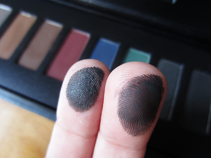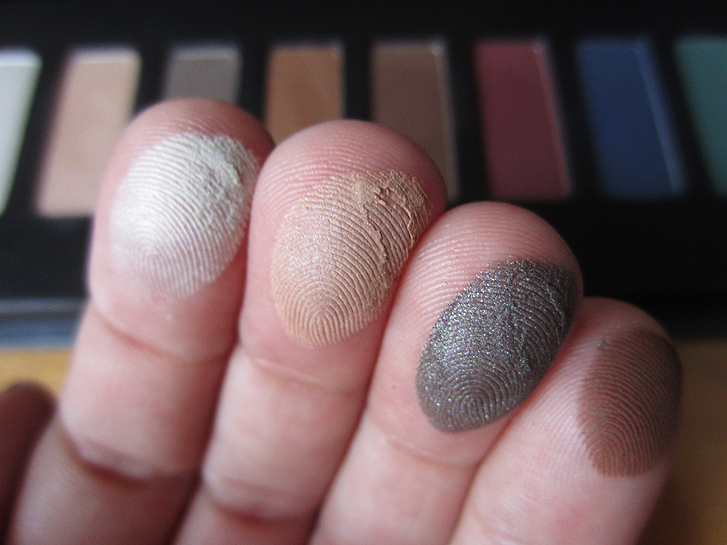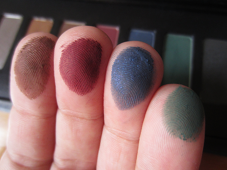 As sombras são muito macias e pigmentadas, nas amostras abaixo eu não utilizei primer! Eu tenho usado quase todos os dias a sombra iluminadora Soft Acetinado (segunda da esquerda para a direita) pois dá um efeito muito bonito! Também amei os tons de marrom, o vinho, azul, preto… a cor que eu não curti foi o verde pois acho que não combina comigo. Vamos conferir os swatches: