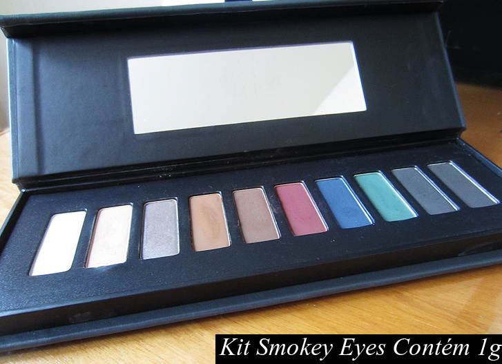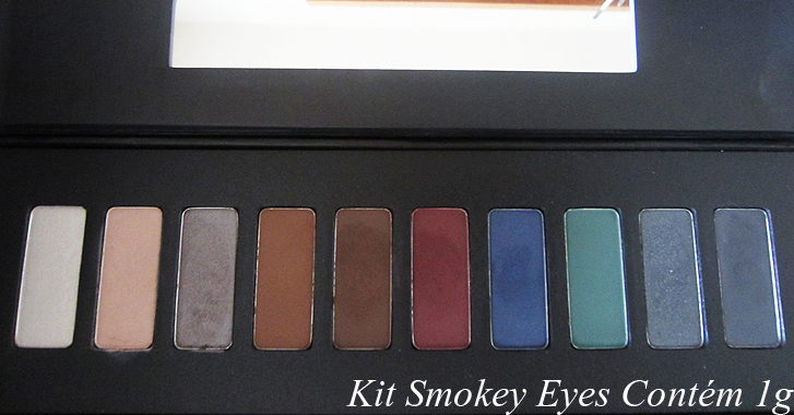 O Kit Smokey Eyes da Contém 1g vem com 10 sombras: 1 sombra compacta Pérola Cintilante; 1 sombra compacta Soft Acetinado; 1 sombra compacta Nut Cintilante; 1 sombra compacta Taupe Opaco; 1 sombra compacta Sépia Opaco; 1 sombra compacta Wine Opaco; 1 sombra compacta Ocean Cintilante; 1 sombra compacta Peppermint Opaco; 1 sombra compacta Dark Grey Cintilante; 1 sombra compacta Preto Opaco.