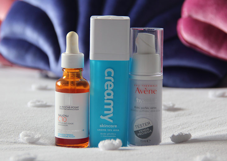 À noite, tenho usado já há algumas semanas esse ácido Glicólico da Creamy. Esse é um dos meus ativos favoritos, sinto muita diferença na minha pele quando uso. O ácido glicólico serve para “dissolver” as células mortas da pele, revelando a camada mais nova e bonita. Uso sempre à noite.
